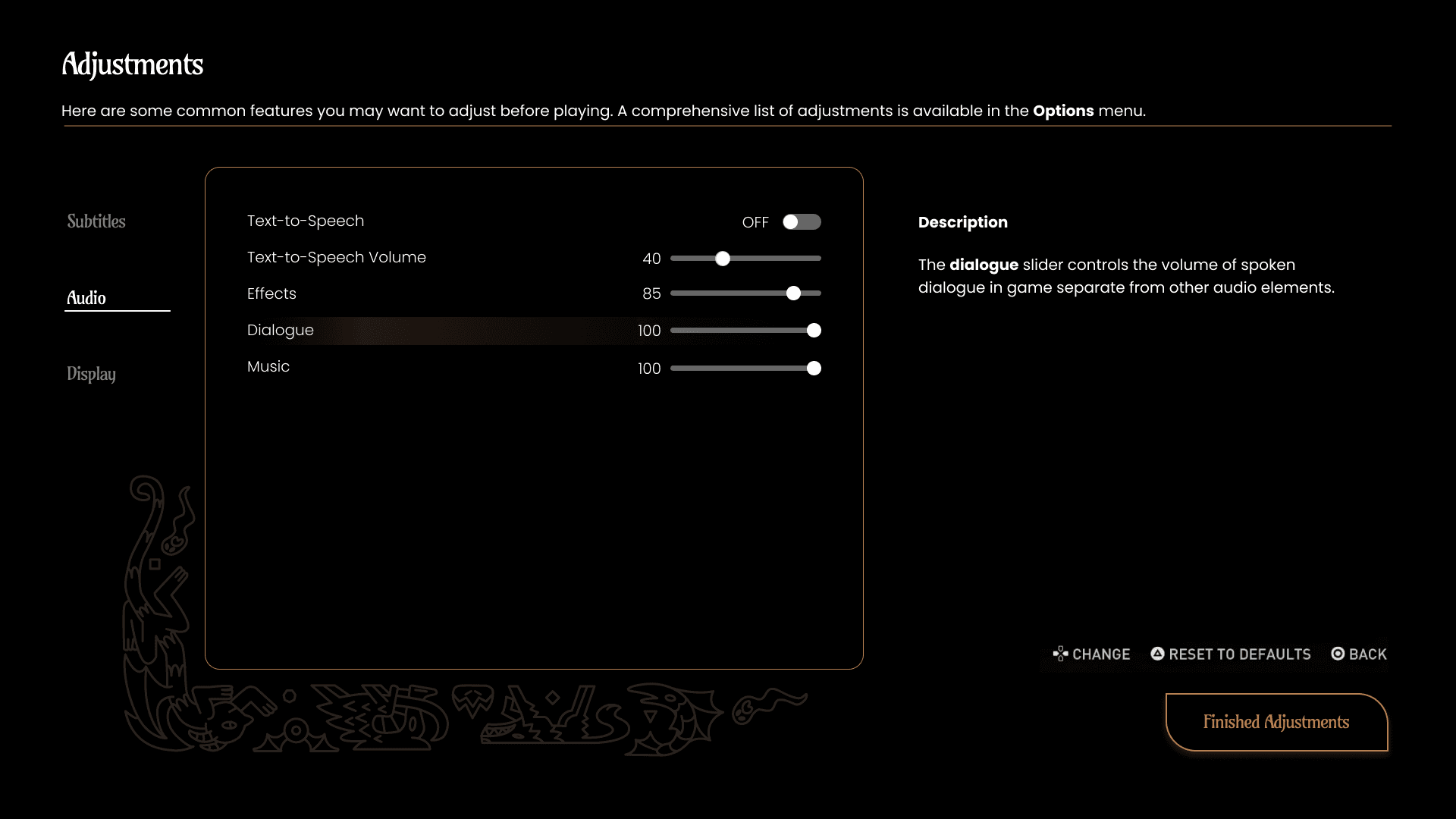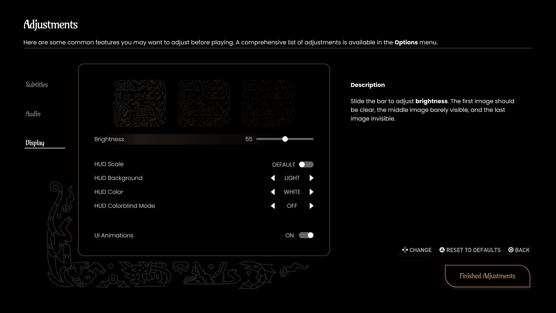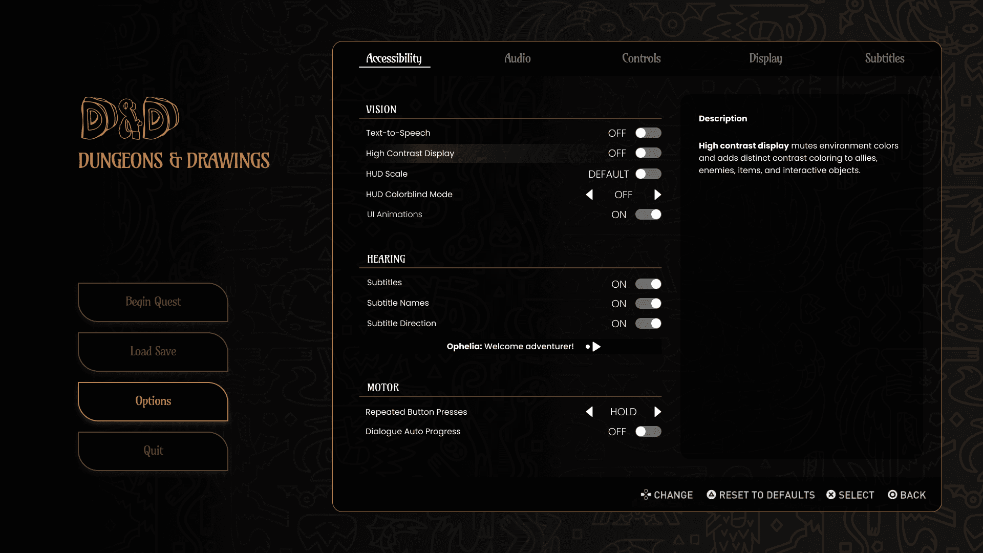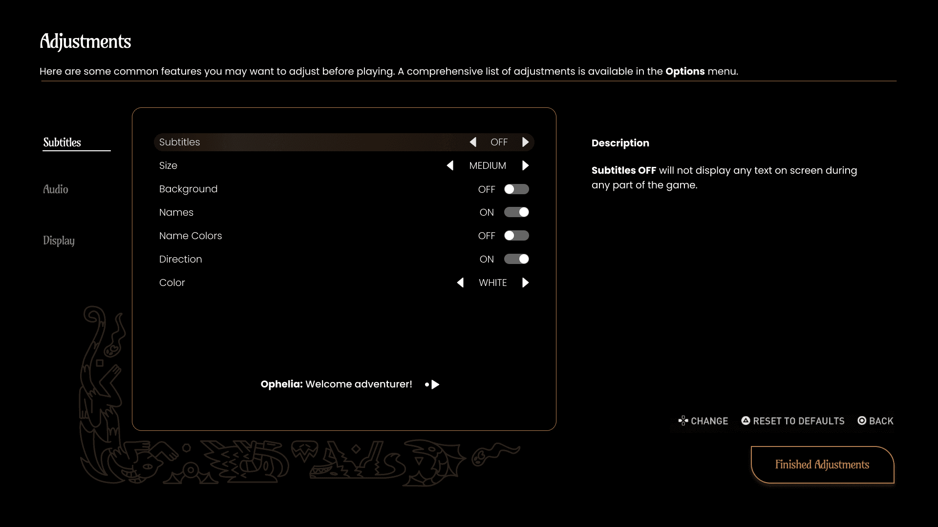 Many games offer the chance for players to alter settings before ever seeing the main start screen. The adjustments provided at the start were inspired by what the AR application's mechanics were. Since there was a lot of dialogue involved with the game, it made sense to let players adjust subtitles options right away.