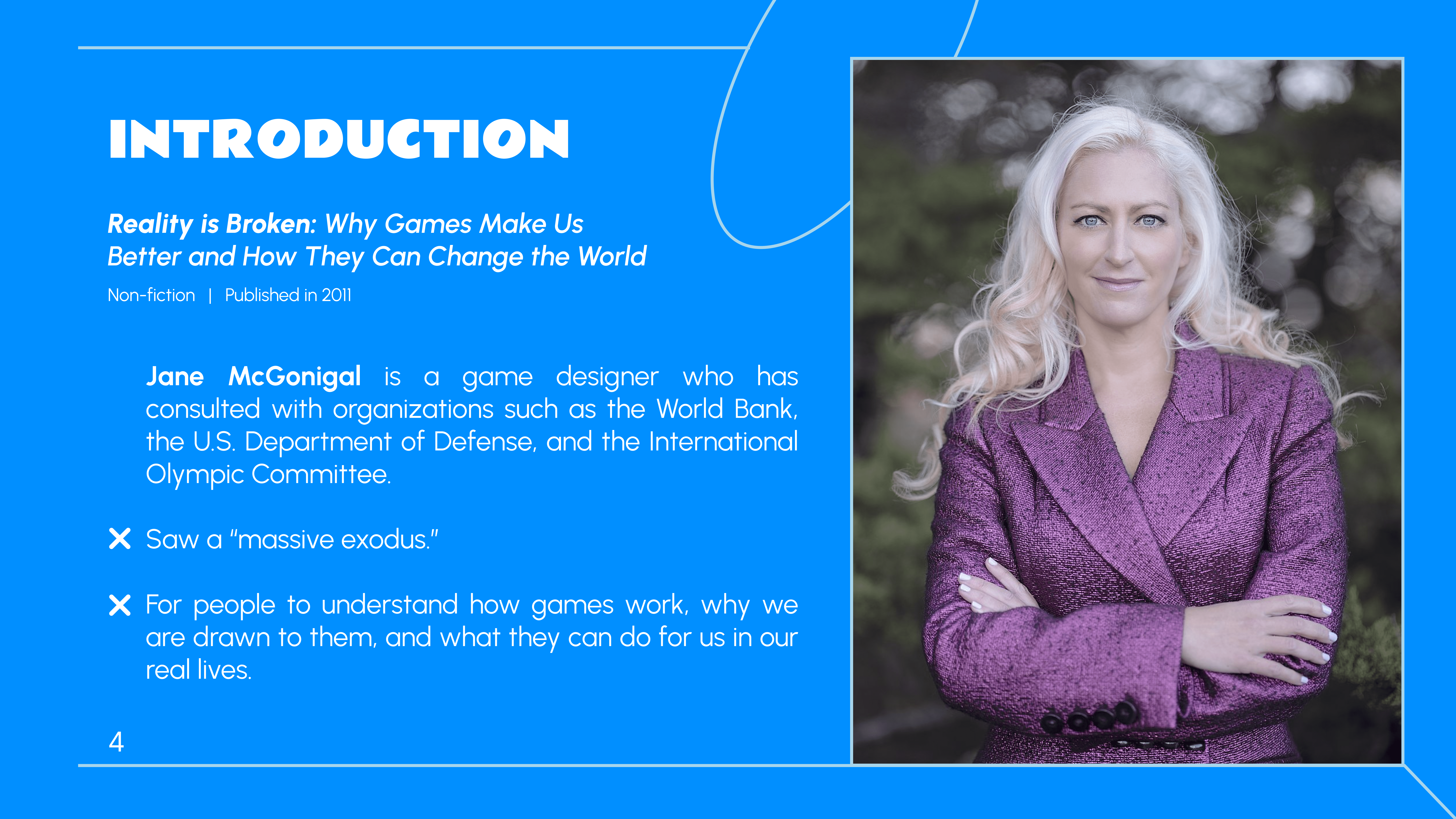 Reality Is Broken: Why Games Make Us Better and How They Can Change the World is a non-fiction book published in 2011 by Jane McGonigal. It argues that reality is broken compared with games. Games often fulfill human needs that the real world cannot, and can provide easy-to-understand ways of implementing real change. To begin, McGonigal describes people engaging in a "mass exodus" from the real world into games, because of the need to feel fulfilled, purposeful, and engaged. Her main goal is to outline how we can apply game design principles to “fix” this current reality. The book speaks about fourteen fixes on how games are better than reality, and these fourteen points summarize her argument for implementing gamification into the world.