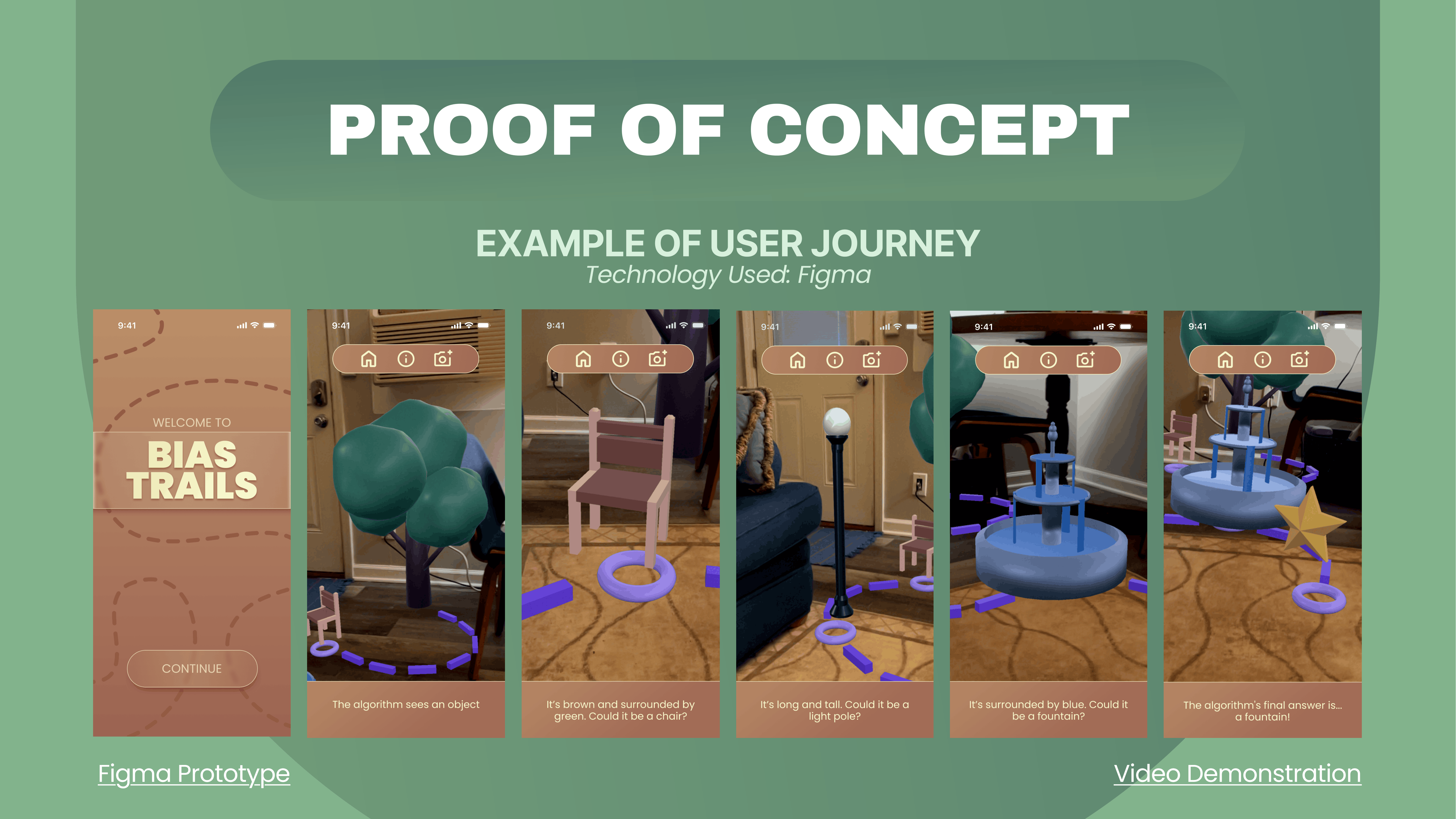 The final product showed the user journey from opening the app to following a trail. The augmented objects were 3D modeled in Maya and a free, web-based software, Web-AR.Studio, was used to prototype how the user may be able to manipulate the trails.