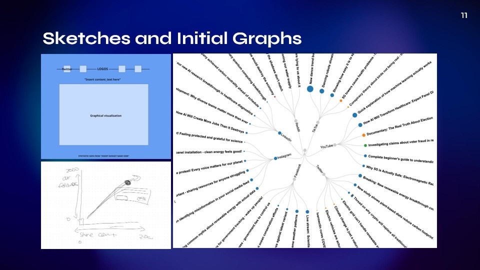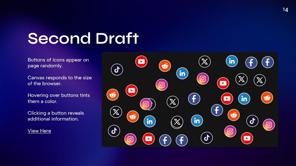 Our final product is a scrolling webpage where social media icons begin in a scattered and messy state. As you scroll, they move into clear categories. Hovering over these icons reveals specific information about a post, including if it was flagged for misinformation.