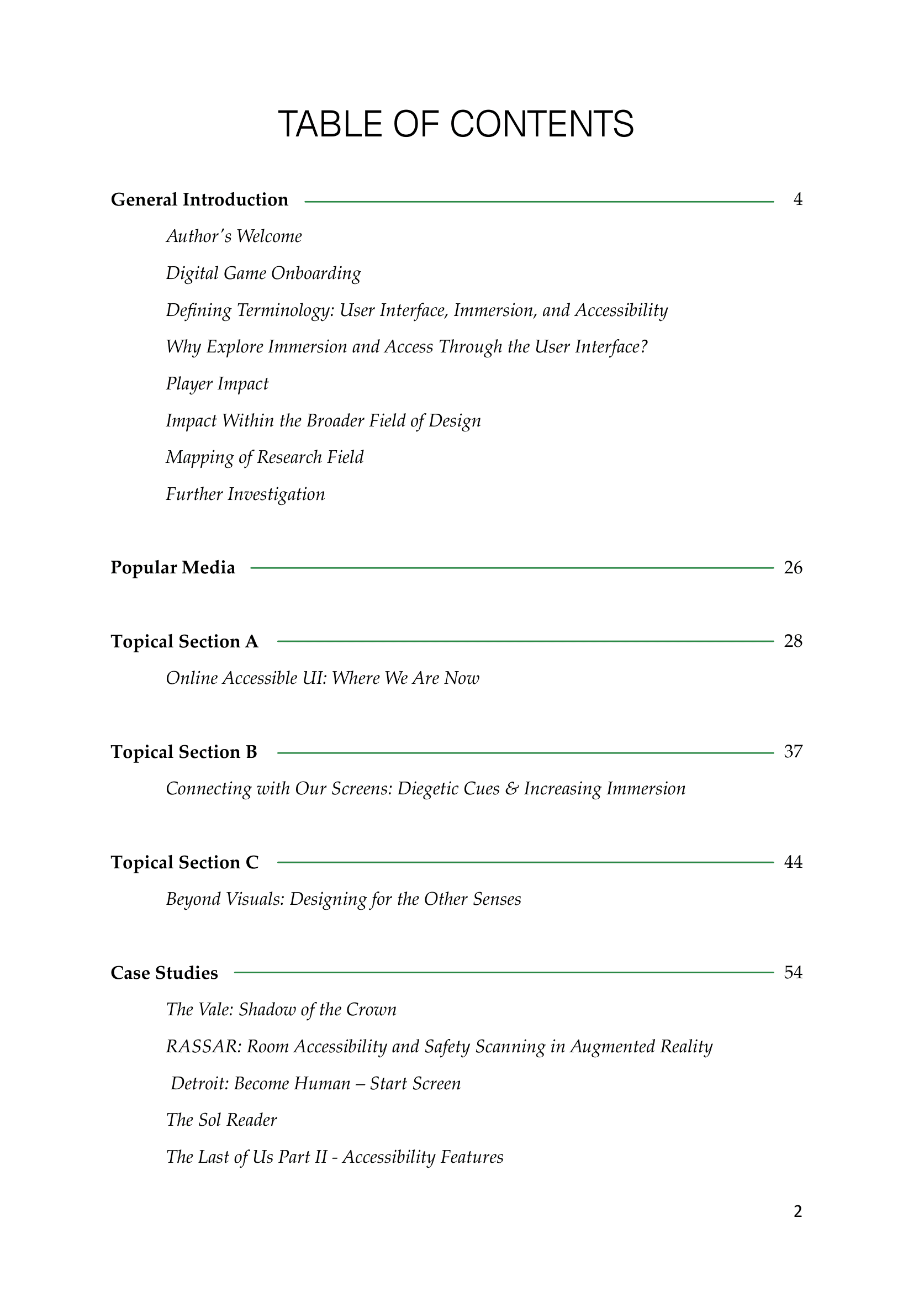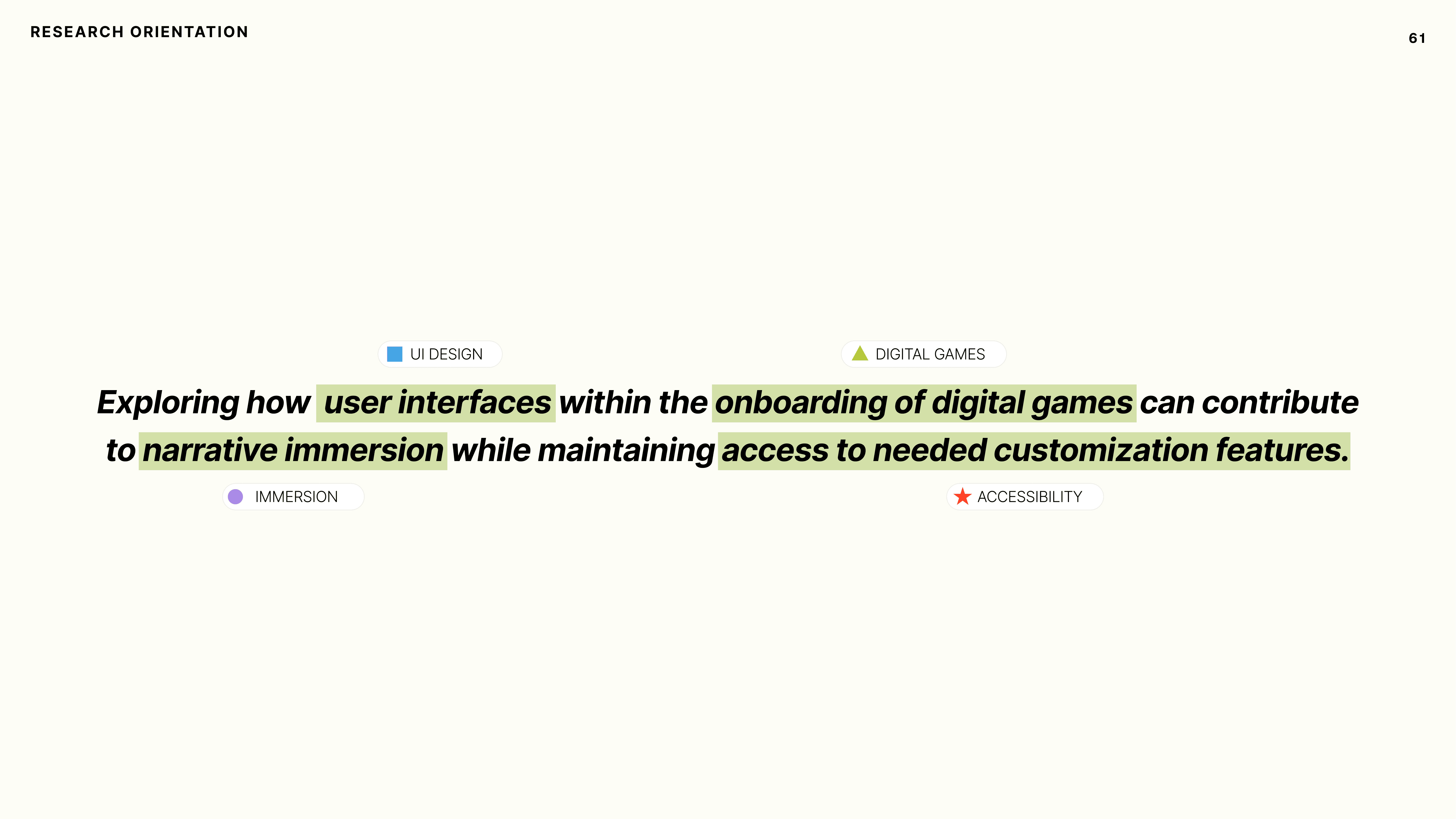 This semester, we were tasked with creating a handbook that would help flesh out and articulate our research orientation. I combined my interests in UI, immersion, and accessibility within the context of digital games.